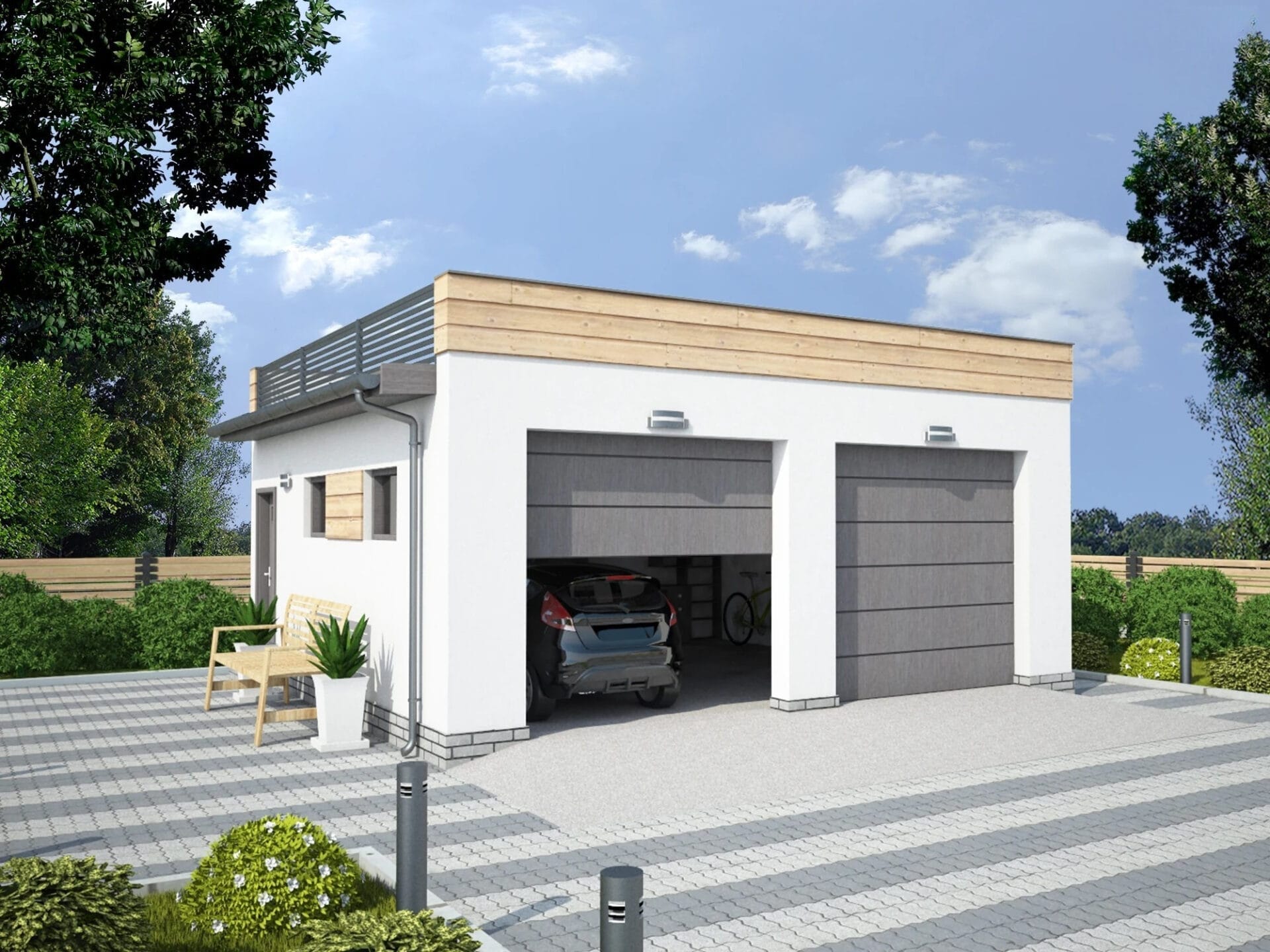 Traditional technology: – usable area – 36,00m2 – built-up area – 42,25m2 – total area – 42,25m2 – cubic capacity – 156m3 – external load-bearing masonry walls 25cm thick – all walls made of “POROTHERM” ceramic blocks – height of the building 3,44m – gable roof 3° – wooden rafter framing – roofing: tar paper – dimensions of garage doors 2,3×2,4m Ask about the availability of the project in a frame version. In the projects we recommend: Porotherm, Koramic, Terca products of the company