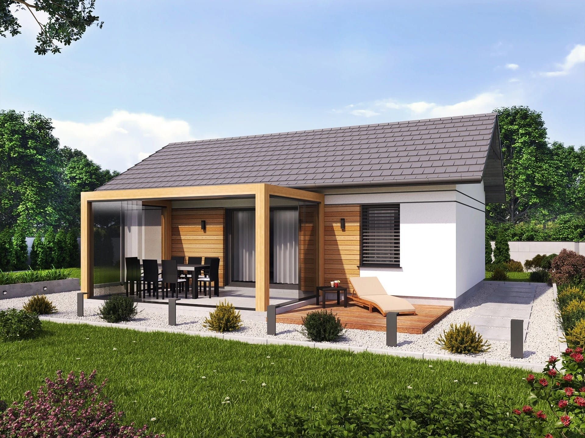 A bathroom, a kitchen with a living room, a utility room and a pergola/leisure world with the possibility of glazing connected to the living room complete the design.