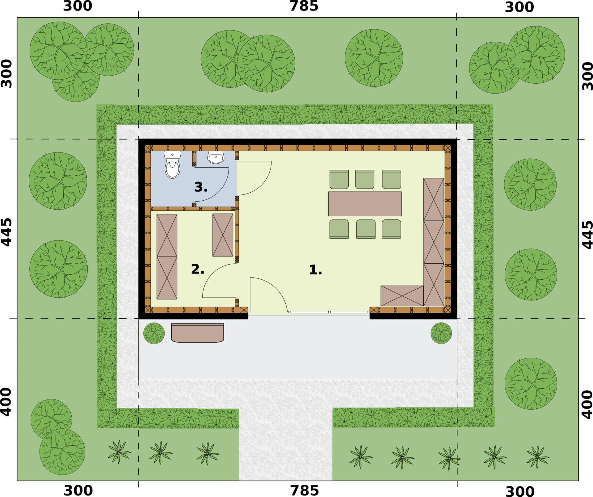 KONSTRUKCJA: Główne rozwiązania konstrukcyjno-materiałowe: Projektowany budynek wykonany będzie w technologii lekkiego szkieletu drewnianego. Główną konstrukcję nośną stanowić będą: ławy, ściany fundamentowe i wieniec wykonane jako betonowe zbrojone konstrukcyjnie, słupy drewniane, ściany nośne w szkielecie drewnianym spięte podwójnym oczepem, dach dwuspadowy oparty na więźbie o konstrukcji drewnianej krokwiowo-jętkowej.