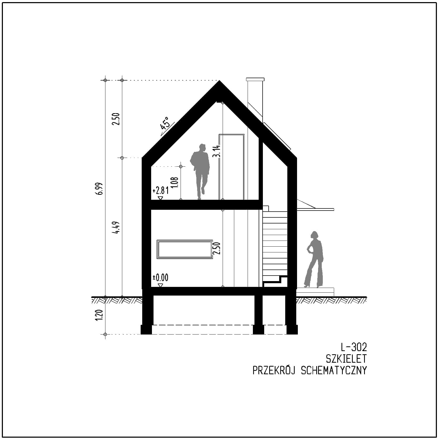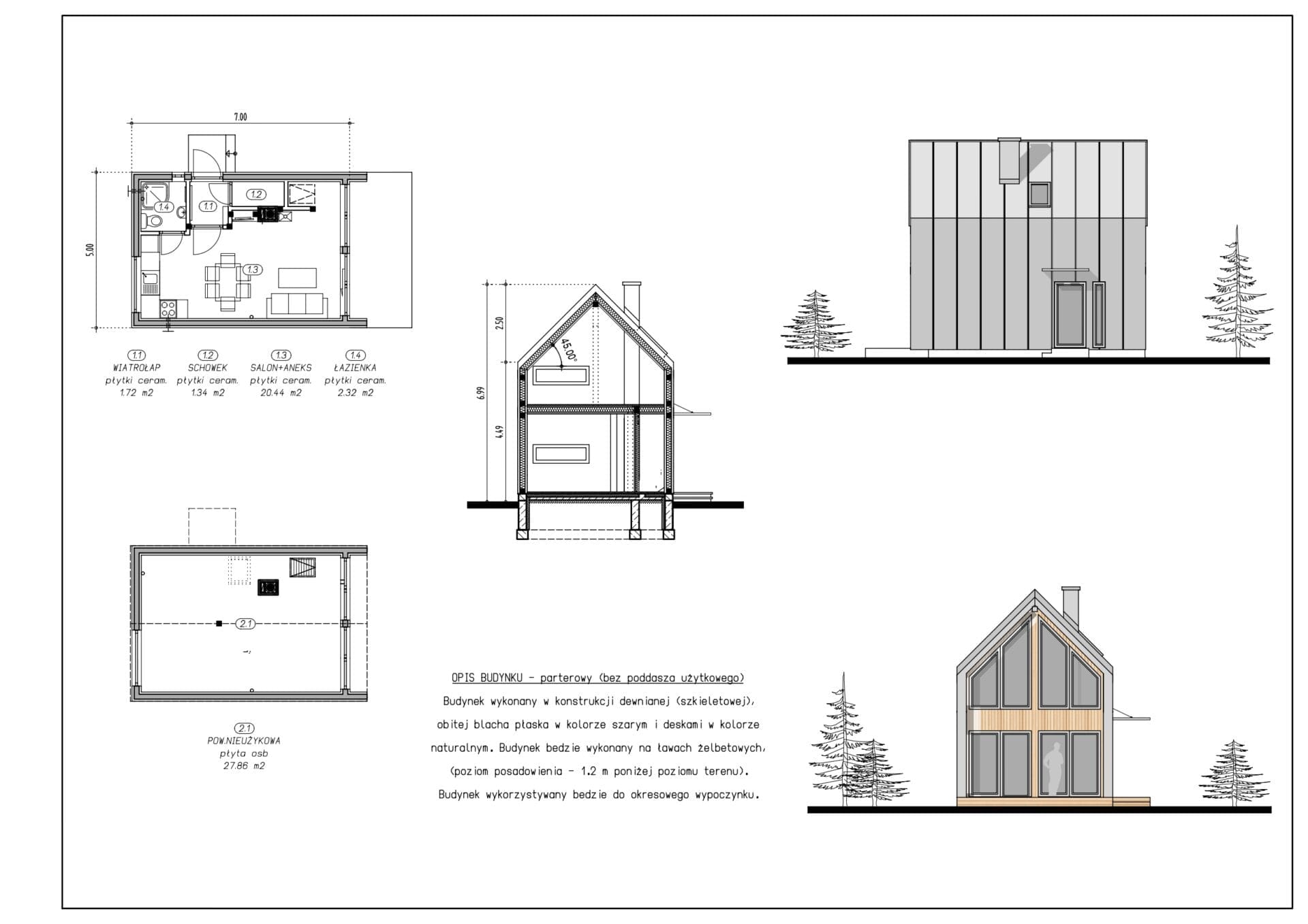 Konstrukcja drewniana krokwiowo – płatwiowa z płatwią w kalenicy gr. 16×16 cm z drewna sosnowego lub świerkowego klasy C24. Dach w całości pokryto łatami i kontrłatami. Krokwie o wymiarach 10x18cm, kontrłaty 2,5 x 5 cm. Wszystkie elementy drewniane należy zabezpieczyć przed korozją biologiczną przez min. 2-krotne smarowanie preparatem solnym np. „Intox S” wg wyników i wyników producentów lub inne środki dopuszczone do stosowania w budownictwie mieszkalnym, elementy przed drewnianymi grzybami, owadami i ogniem.