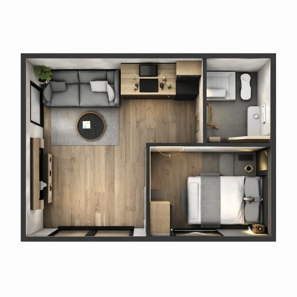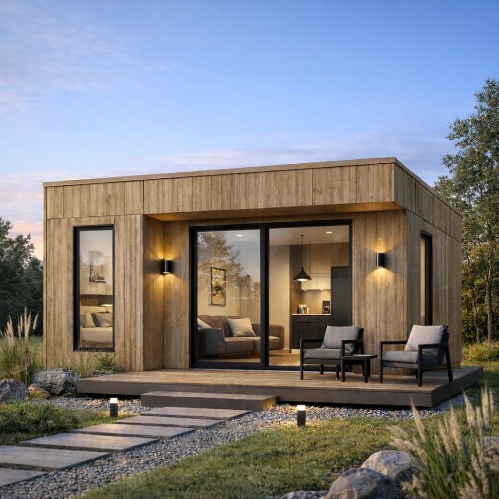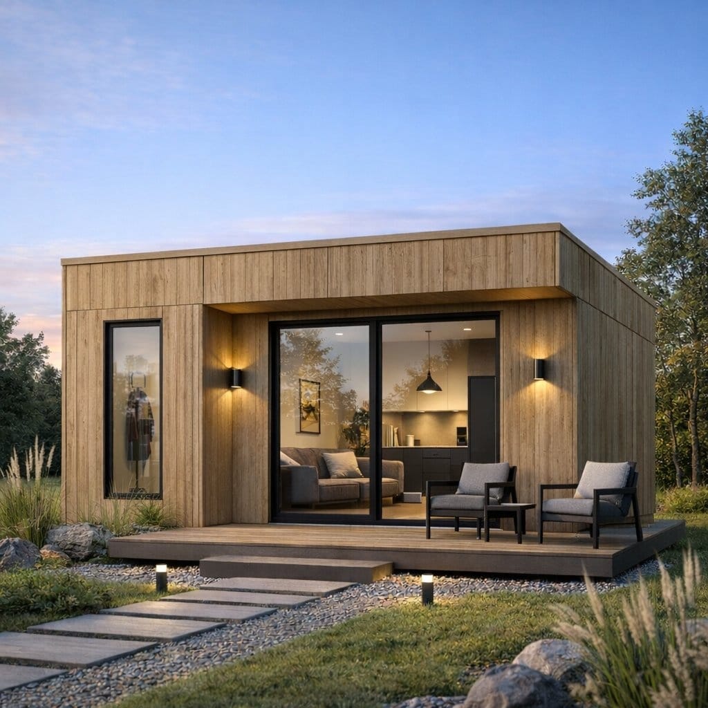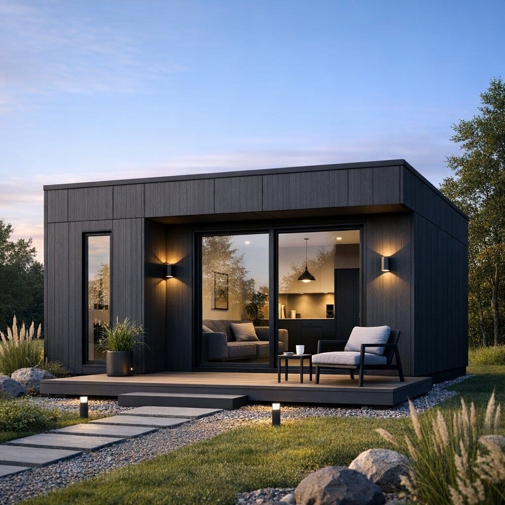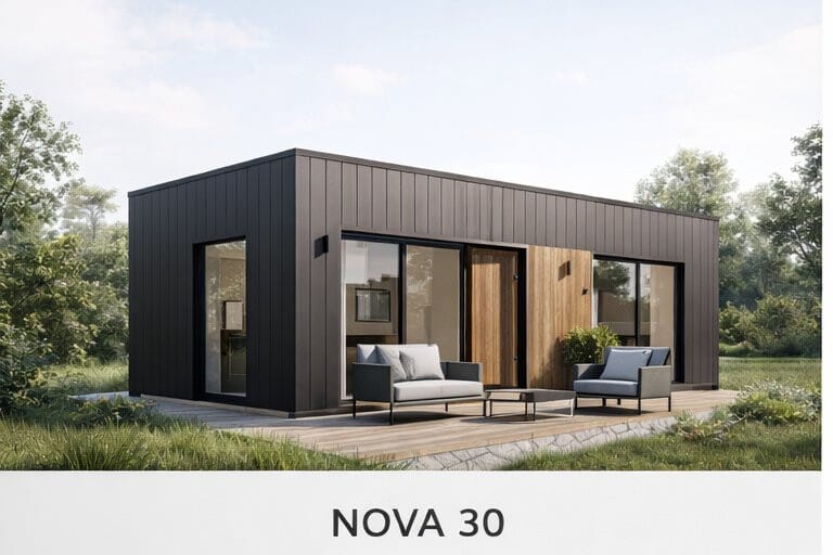 Nowoczesny dom modułowy 30 m² o wyrazistej, minimalistycznej bryle. Idealny dla 1–2 osób, jako szybki dom całoroczny, domek inwestycyjny lub komfortowy house office z funkcją noclegową.