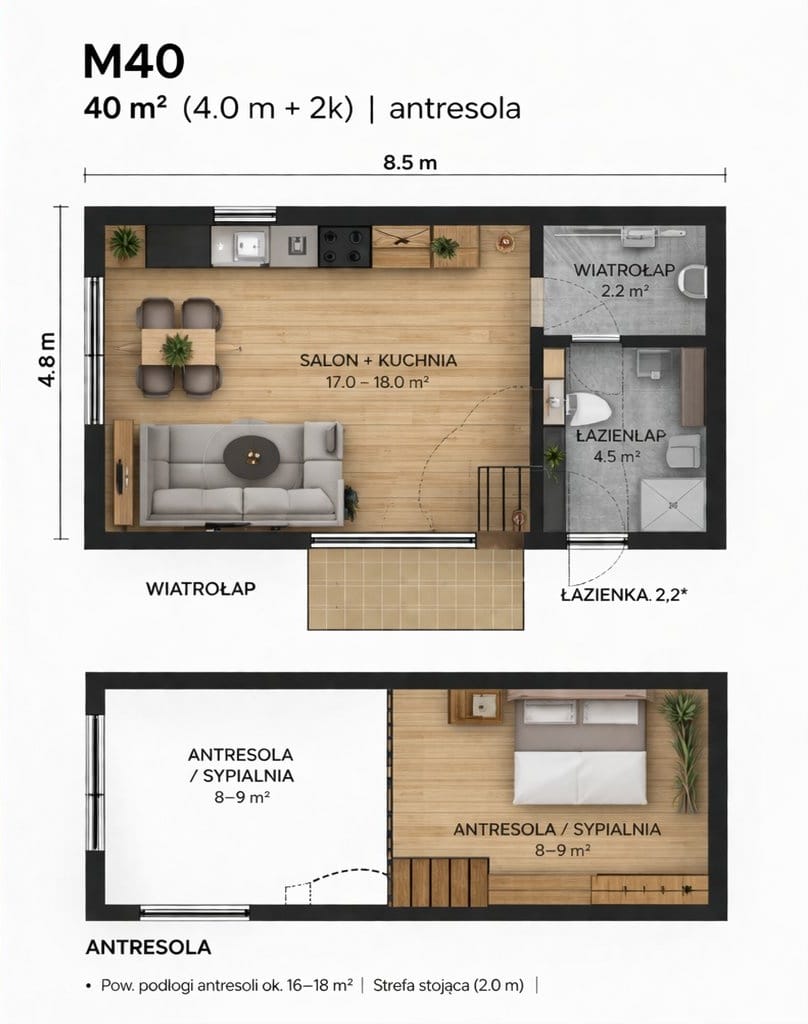 Nowoczesny dom modułowy o powierzchni 40 m² (5 x 9 m) z antresolą, zaprojektowany jako kompaktowa, ale w pełni funkcjonalna przestrzeń do życia całorocznego.